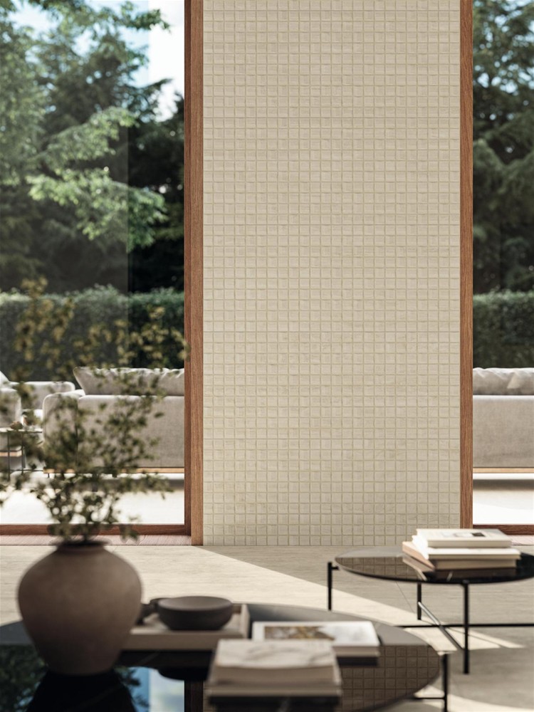 Marvel T je výsledkom hĺbkového výskumu travertínu a ponúka modernú a textúrovanú interpretáciu, ktorá zostáva verná elegancii a vizuálnemu dopadu prírodného kameňa. Exkluzívne farby rozprávajú rôzne príbehy: Halo, najbelší travertín, zachytáva svetlo a vzácnosť jedinečného lomu.