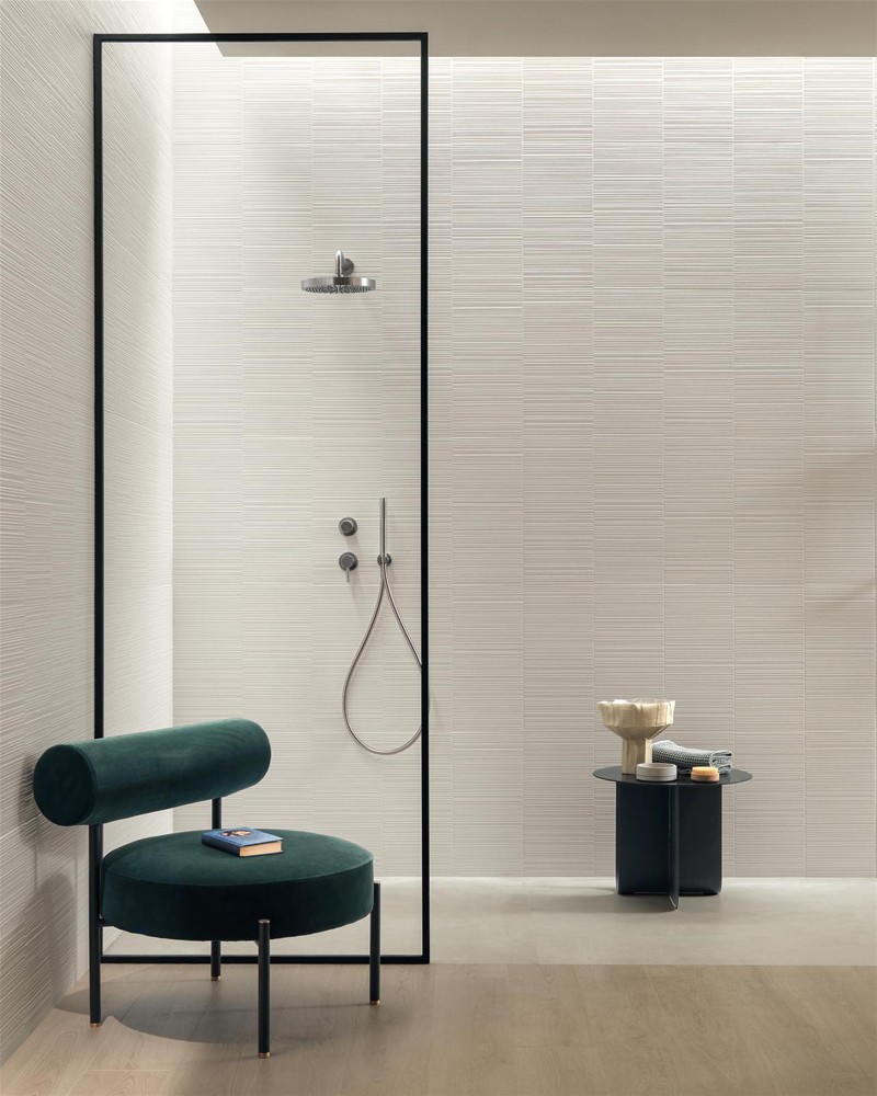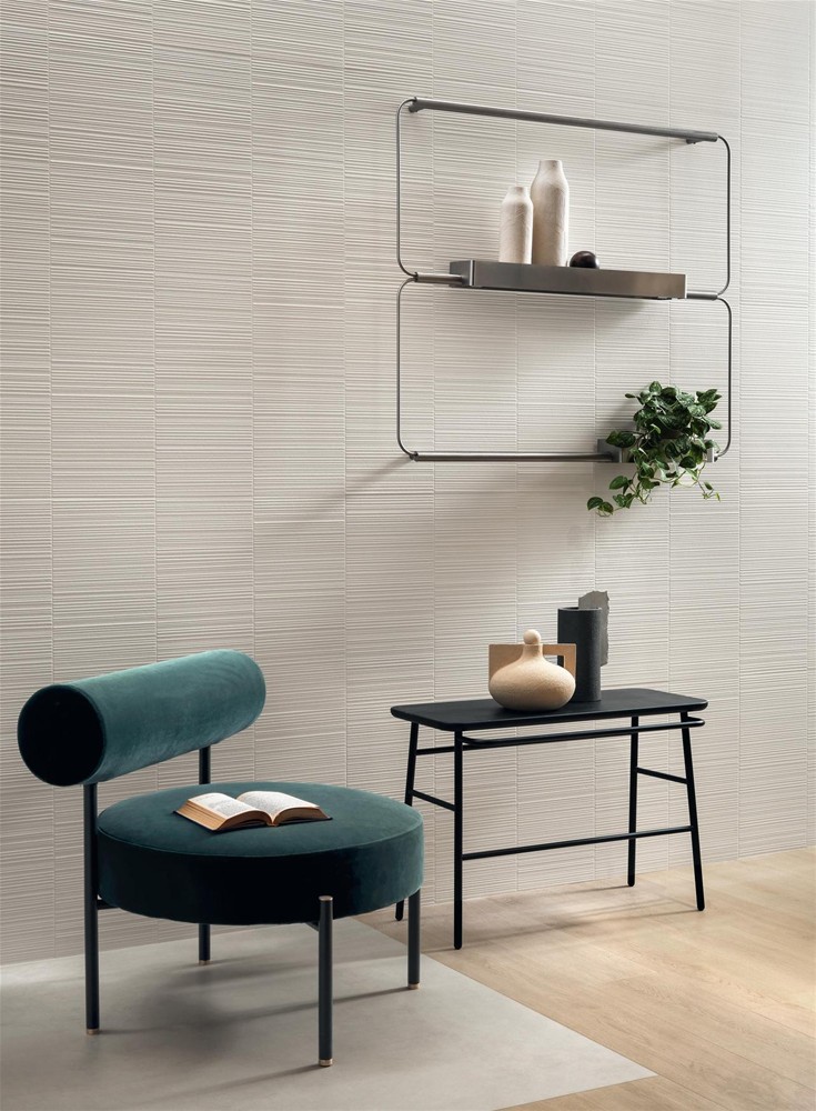 Päť trojrozmerných povrchov pokrývalo veľké steny pôvodnými dekoratívnymi vzormi, čím vytváralo priestory s elegantným, jednoduchým štýlom.