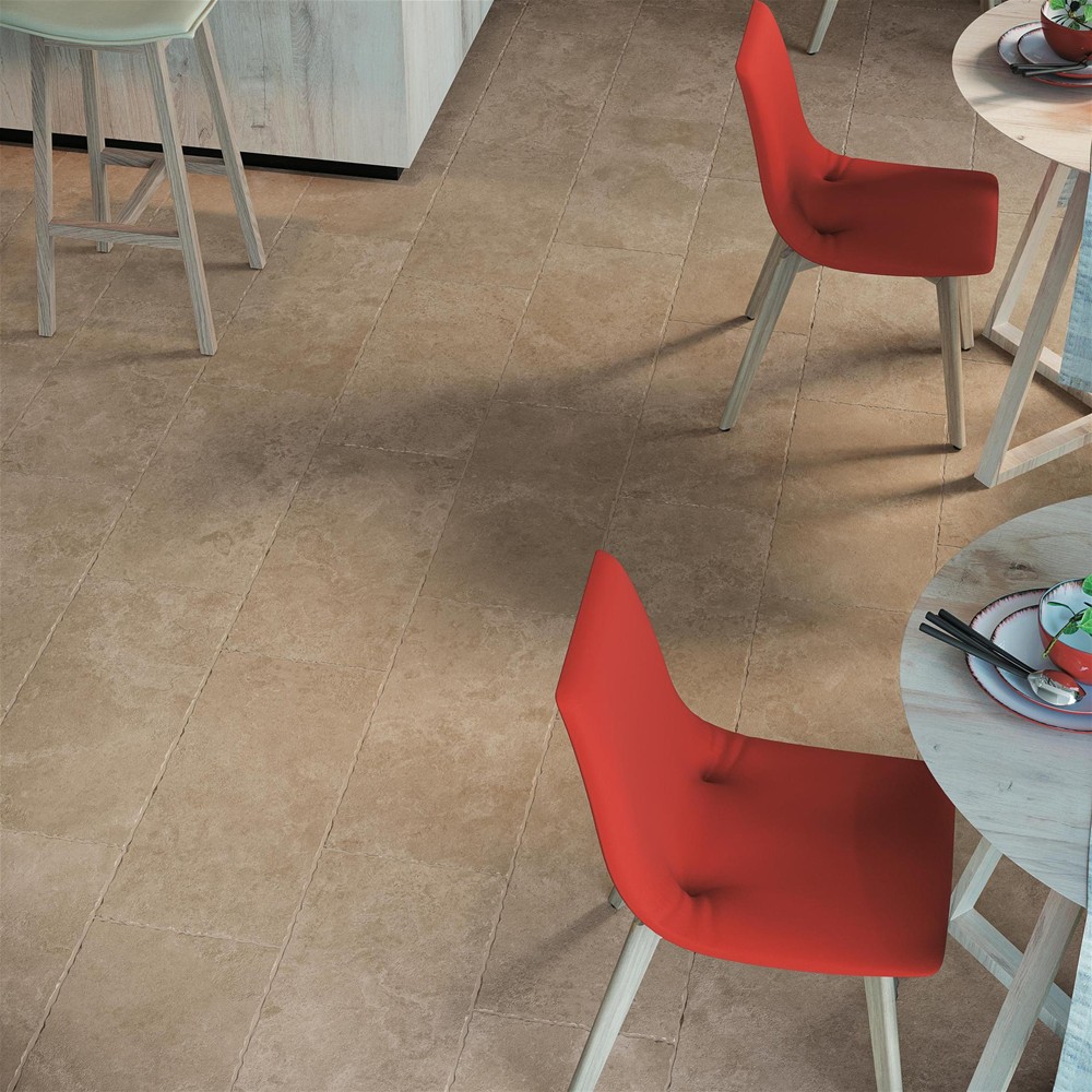 Štiepaný kameň Diesis od Chiancy Leccese je inšpiráciou pre kolekciu porcelánových dlaždíc s tromi farbami, ktoré maximálne zvýrazňujú jej lieskovoorieškové odtiene.