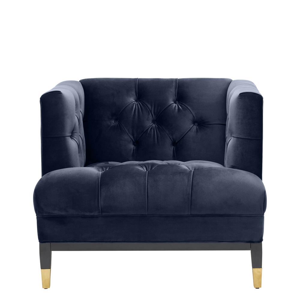 Tmavo-modré zamatové kreslo Castelle s gombíkovým dizajnom, čiernymi nožičkami a zlatými špičkami.