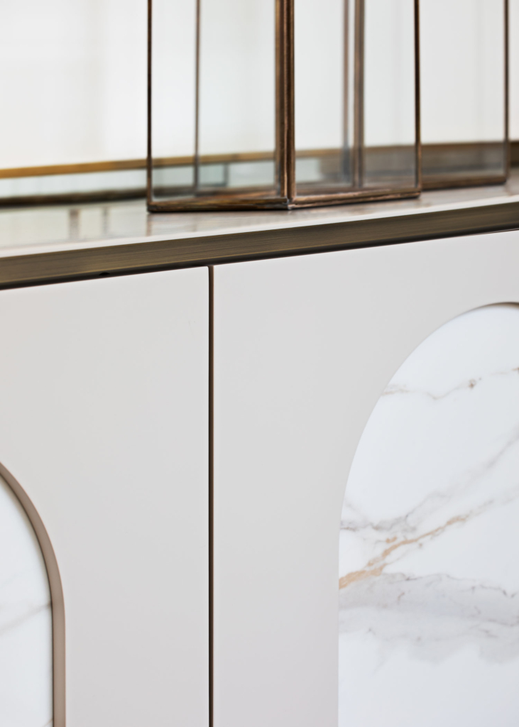Základňa z kovovej úprave, kovové profily a detaily, lakovaná štruktúra, lakované oblúky, vnútorné police z tvrdeného skla. Voliteľné led podsvietenie.