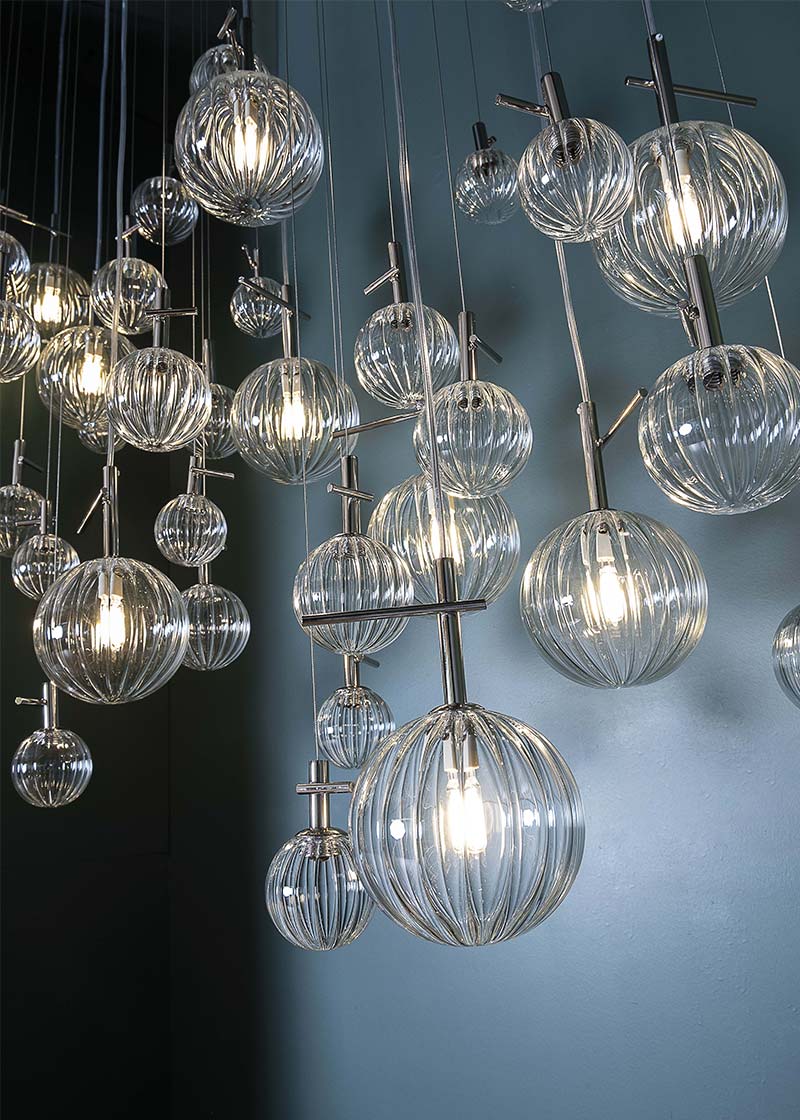 Fúkané sklo priemer 12cm, 8cm a 6cm. Väčšie sklo je s lampou G9, ktorá osvetľuje nepriamym svetlom malé guľôčky vytvárajúce nádherné odrazy svetla.