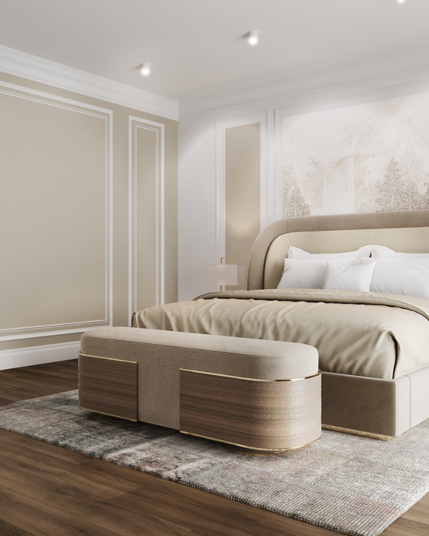 NORA BED je celočalúnená s elegantným mosadzným detailom na základni. Elegantný a očarujúci je úžasný doplnok do každej spálne.