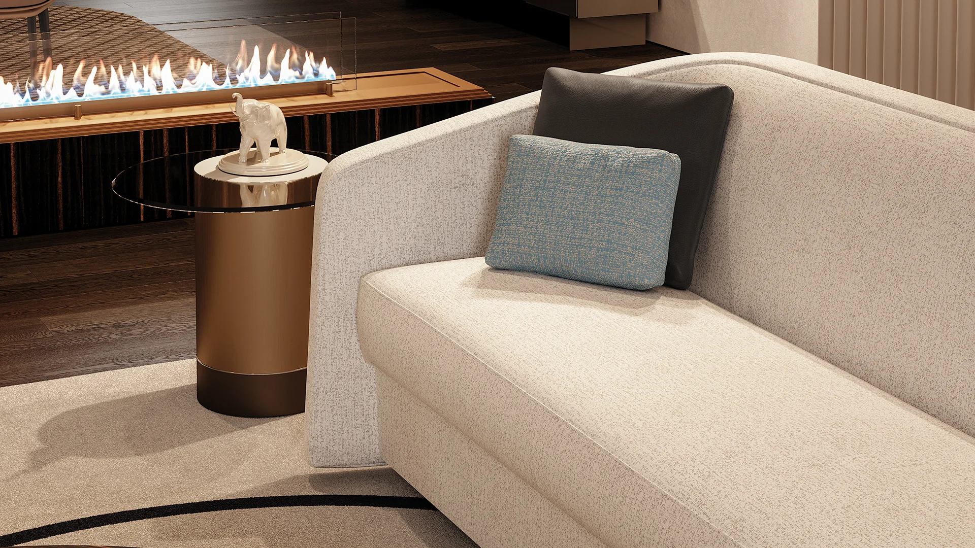 Kolekcia nízkeho a príručného stolíka s cylindrickou základňou lakovaná v lesklej tmavej mosadzi so spodnou časťou zo saténovej matnej mosadze. Spojovacia doska z lesklej ocele. Vrchná doska z 10 mm hrubého bronzového skla so skosením 45°, umiestnená v strede alebo konzolovito.
