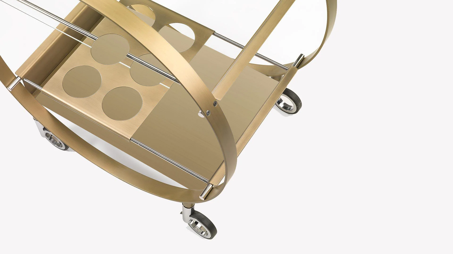 Vozík s konštrukciou z lesklej ocele, vybavený 2 policami/podnosmi z extračíreho priehľadného skla. Konštrukcia dostupná aj v saténovej mosadznej úprave a spodná polica v bronzovom zrkadle.