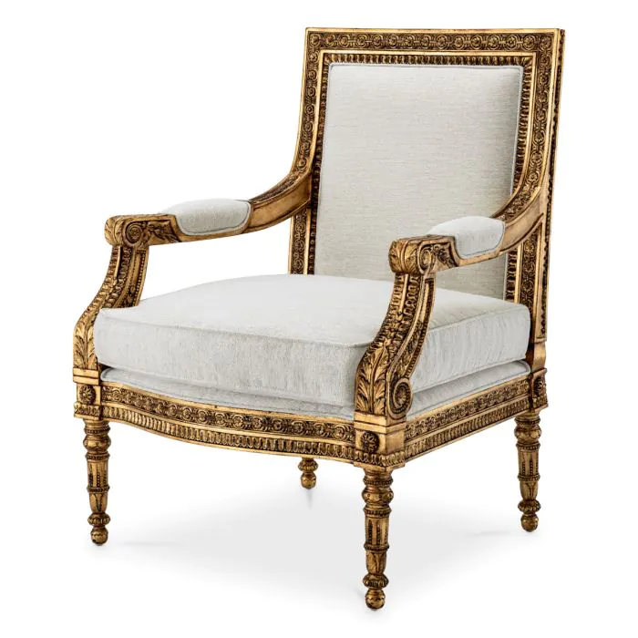 Toto kreslo so starožitným zlatým povrchom a krémovým čalúnením Sentier vzdáva hold majestátnosti originálov z 18. storočia.Kreslo Louis svojím neoklasickým dizajnom a zložitými rezbami zachytáva esenciu éry, ktorá vás pozýva dopriať si luxus histórie a umenia.